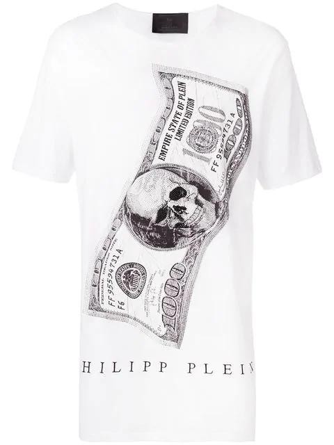 Philipp Plein Dollar Bill Print T-shirt Men 01 White Clothing T-shirts Online StoreCharacterized by the spirit of Rocknroll, Philipp Plein makes clothing for those looking to inject their wardrobe with a slightly darker edge. White cotton Dollar bill print T-shirt from Philipp Plein featuring a crew neck, short sleeves and a print to the front.
