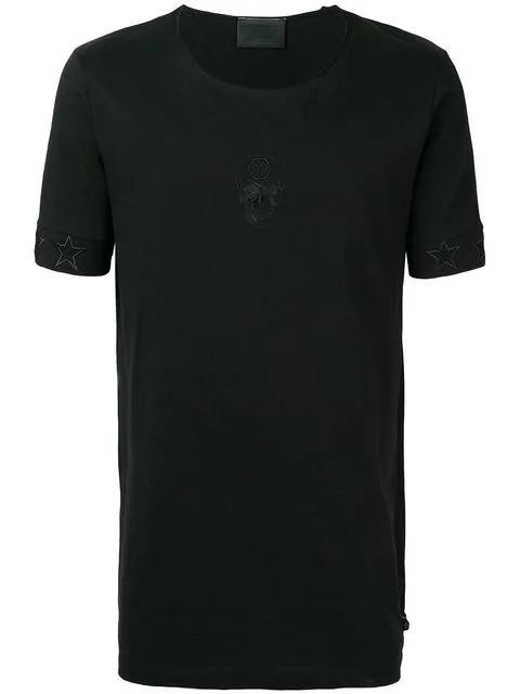 Philipp Plein Embroidered Logo T-shirt Men 0202 Black/black Clothing T-shirts New Collection Philipp Plein's collection exudes hard-edged decadence with an intricate focus upon detailing. This black cotton embroidered logo T-shirt features a round neck, a relaxed fit, short sleeves, star patches to the sleeve, a long length and rear logo plaque.